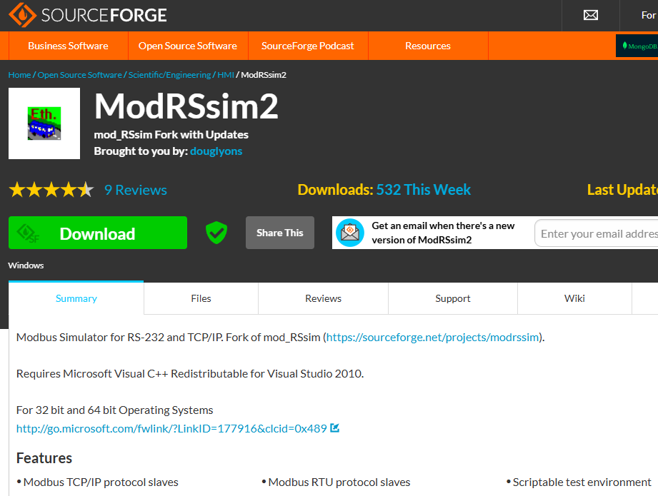 ModRSsim2 是一個免費開源的 Modbus 從站模擬器,可以很方便的在沒有外部設備或 PLC 的情況下測試 Modbus 網路通訊。藉由在電腦上建立從站(slave)模擬,ModRSsim2 可以建立 Modbus TCP/IP 、RS-232 的連線,除了可以變更位址的值,ModRSsim2 也支援依照腳本或隨機的自動刷新位址,來模擬多個感測資料輸入的情況。