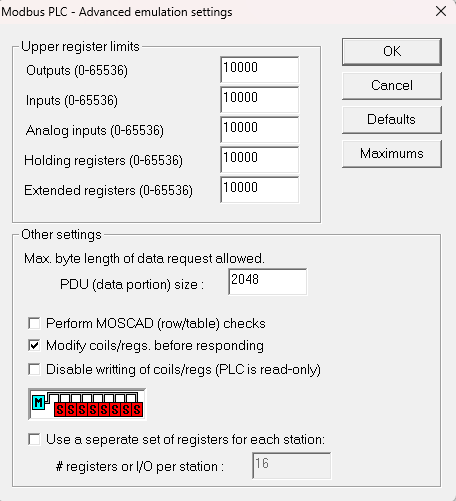 - 作用:設定線圈(Coils/DO)的最大位址號碼,超過此號碼將回傳異常。
