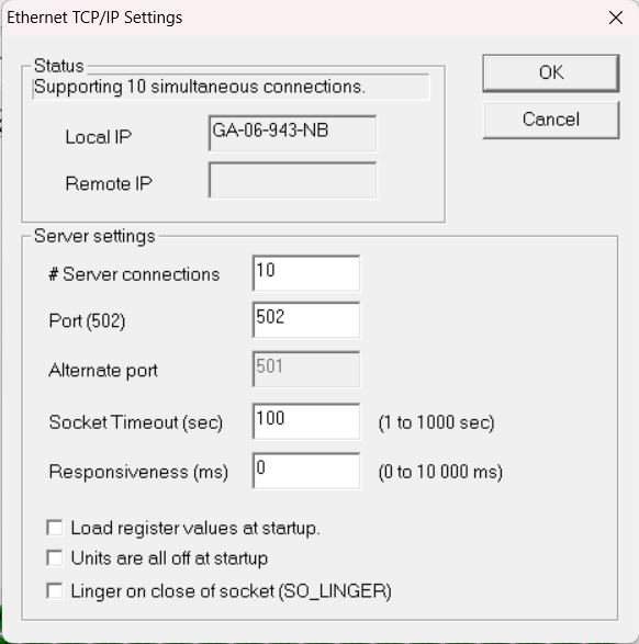 - H 使用 ModRSsim2 時使用本機的 IP 地址 127.0.0.1 ,如果使用外部裝置如 PLC 則填入目標 IP 地址