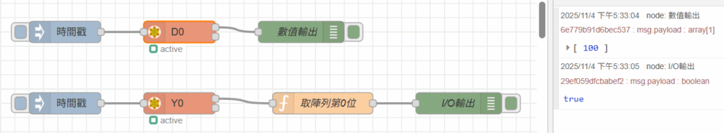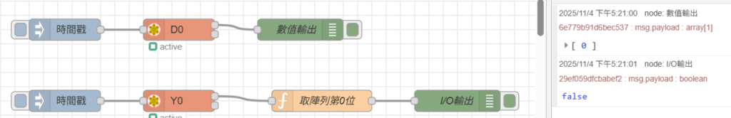 - 觸發數值(D)流程時,msg.payload 輸出 D 值 0